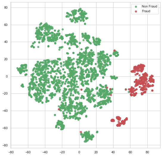 실제로 해당 compitition에서 가장 추천을 많이 받은 코드는 non-fraud도 fraud sample 개수 만큼 sampling 하고, scale 후 t-SNE로 차원 축소하고, 그 값으로 다시 Classification한 코드이다.