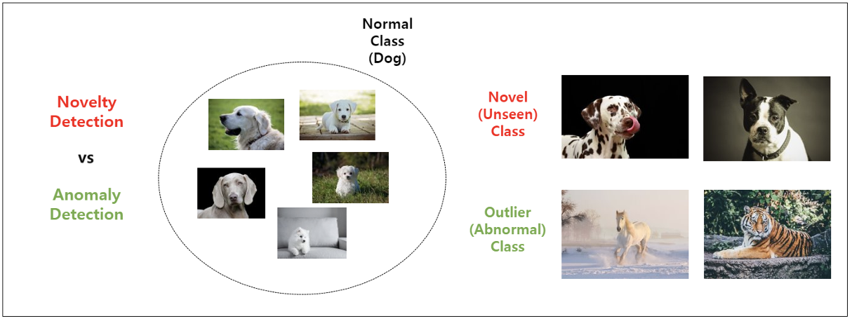 위 예시에서 강아지 사진들을 Normal Class라 정의했을 때, 강아지 사진이긴 하지만, 이전에 없던 형태의 새로운 강아지가 등장하는 경우, 이러한 sample을 찾아내는 것을 Novelty Detection 이라 한다. 즉, 지금까지 등장하지는 않았지만, 충분히 등장할 수 있는 sample을 찾아내는 연구에 적합하다.