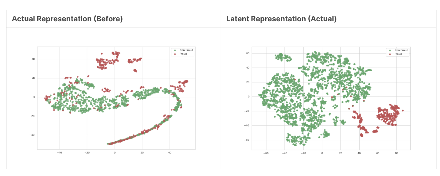 이렇게 보면 오토인코더의 결과가 Fraud와 non-Fraud를 구분하기 훨씬 좋아보이나, 사실 두 알고리즘에 인풋으로 들어가는 데이터가 다르다.