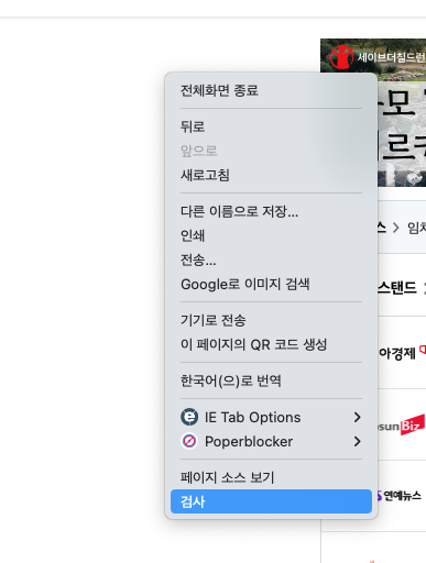 아무곳이나 우클릭 -> 검사(혹은 페이지 소스보기)를 누르면 해당 웹페이지가 어떻게 짜여져 있는지 소스코드를 볼 수 있다.