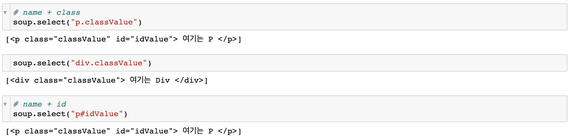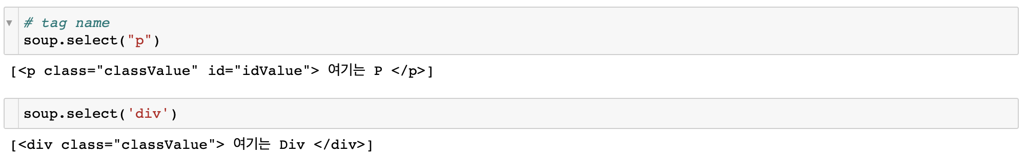 tag_name의 예로는 p, span, div, strong 등이 있고, attribute의 예로는 id, class 등이 있다.