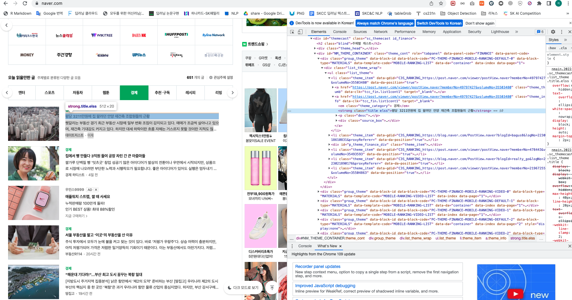 다음과 같이 검사창에서 특정 코드에 마우스를 가져다대면 해당 코드가 웹 페이지의 어느부분을 구현한 건지 하이라이트된다.