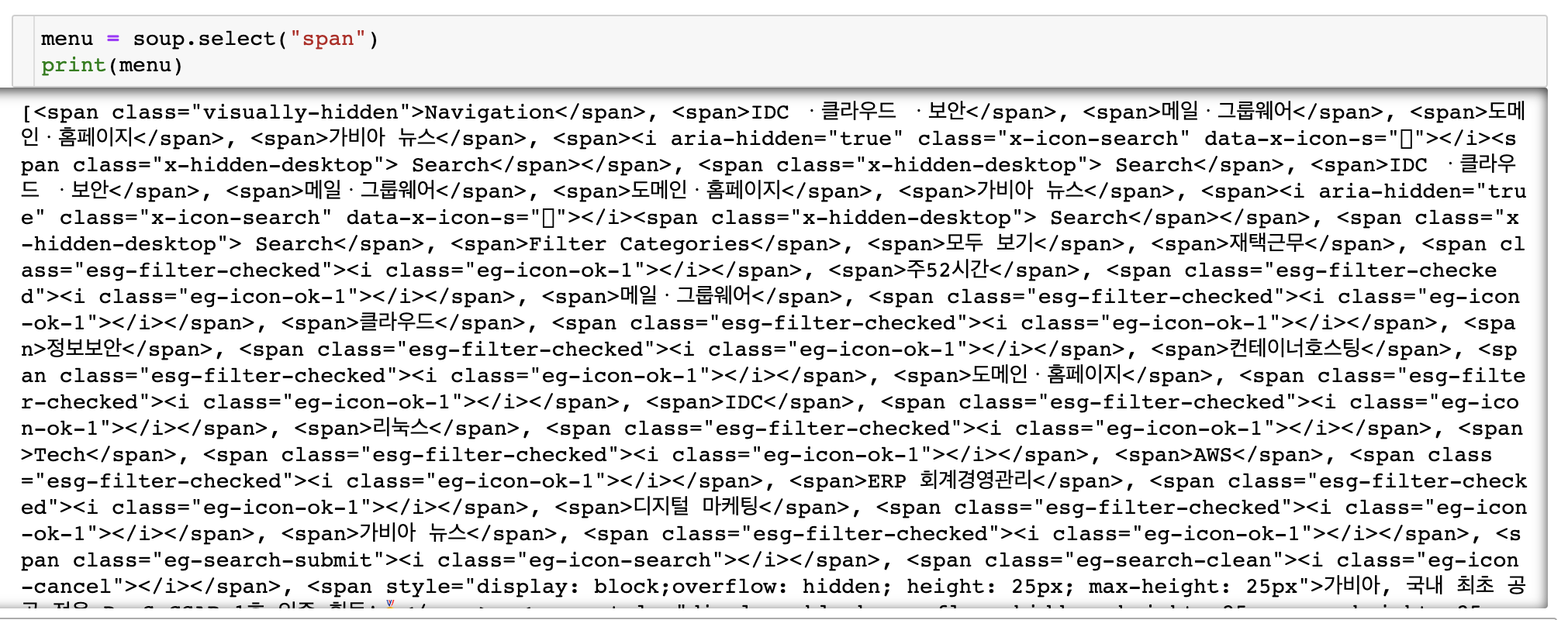 "span"이라는 tag가 워낙 많이 쓰이는 테그이다보니 원하는 정보들 뿐 아니라 너무나 많은 tag들이 검색된 것을 볼 수 있다.