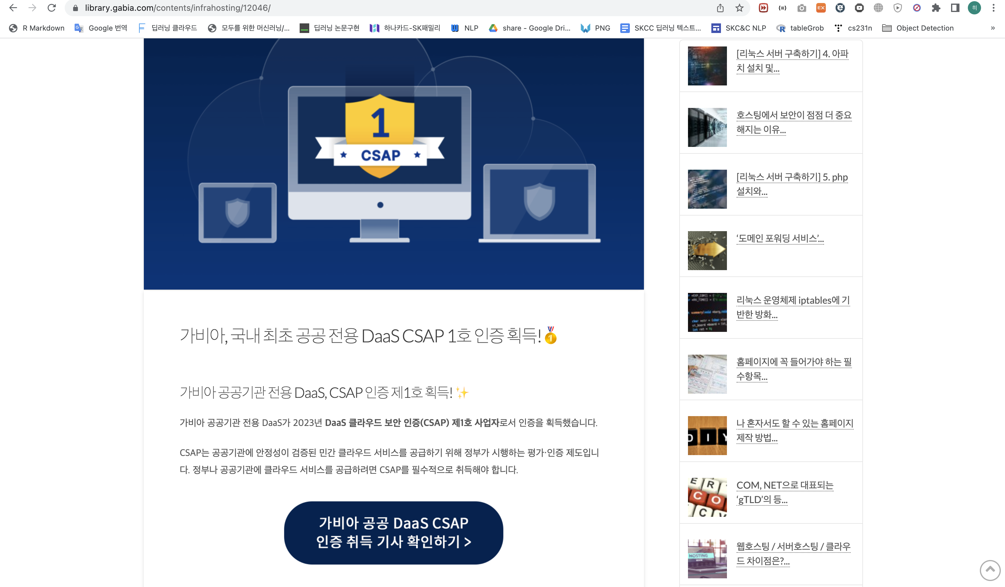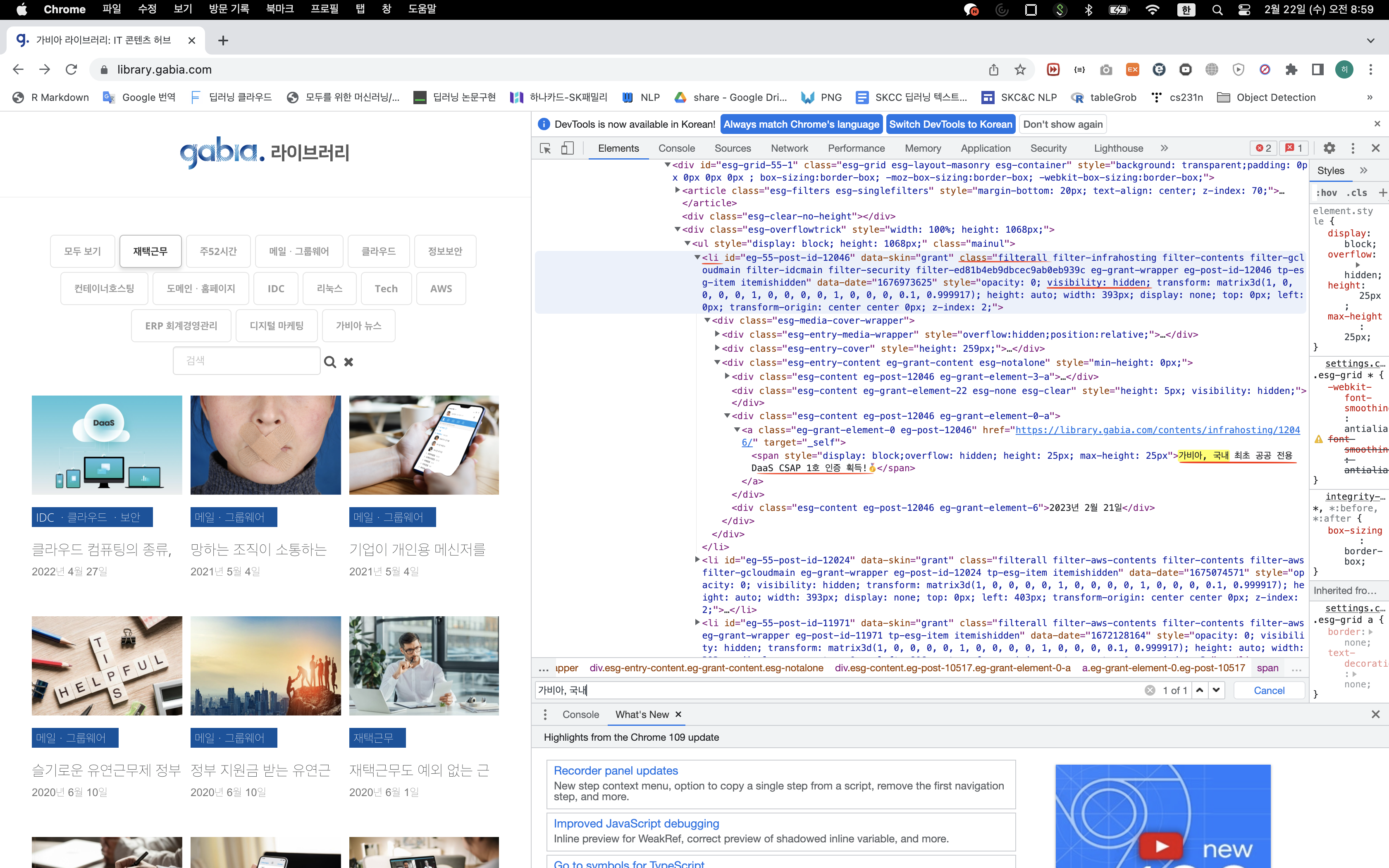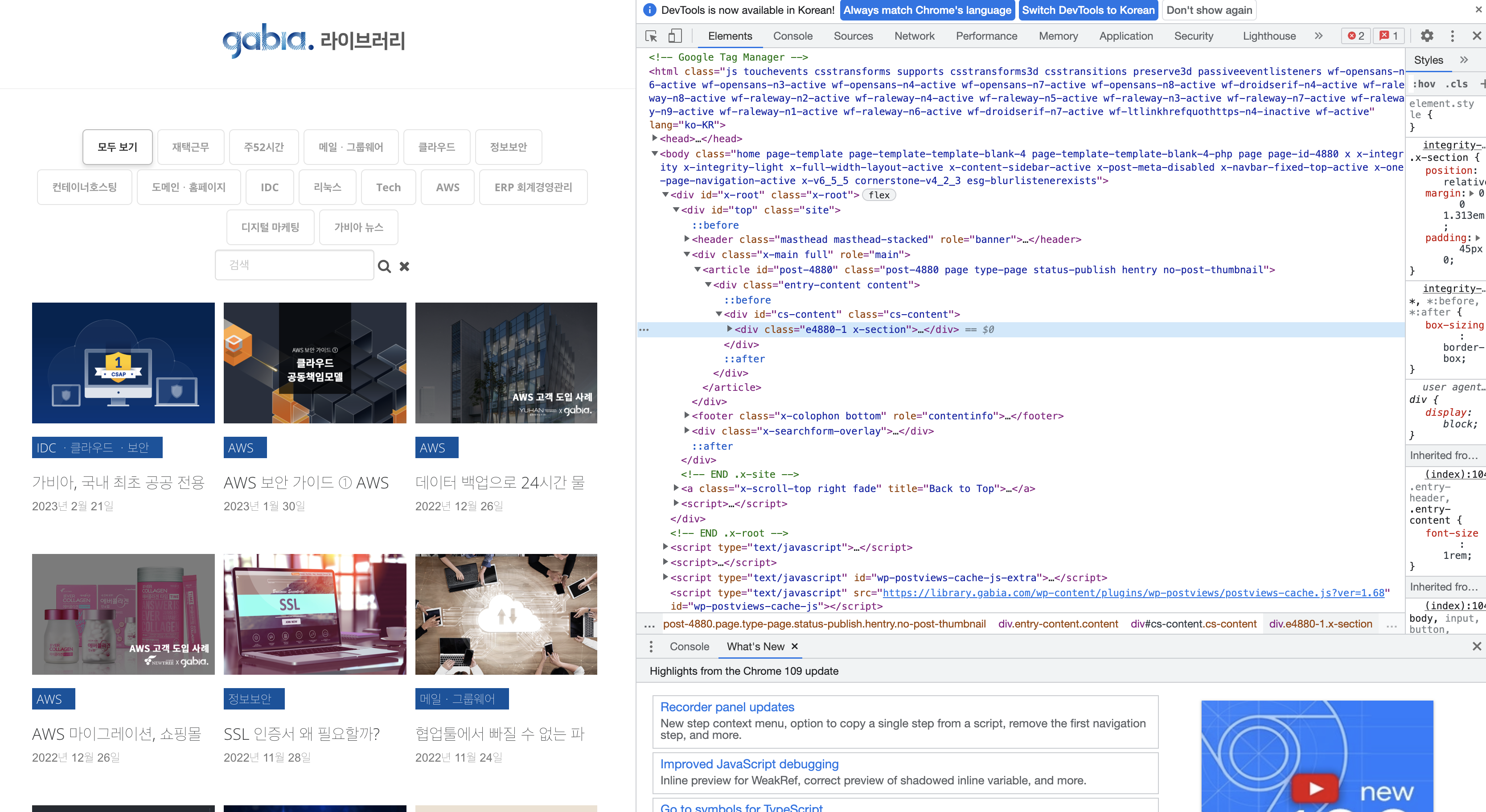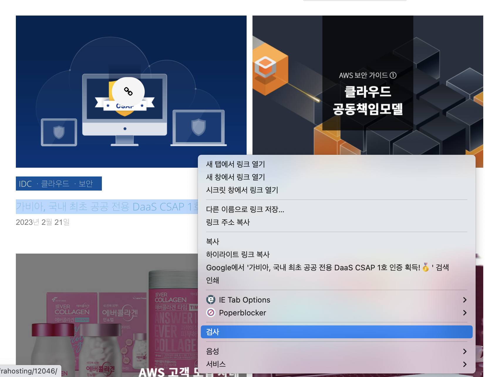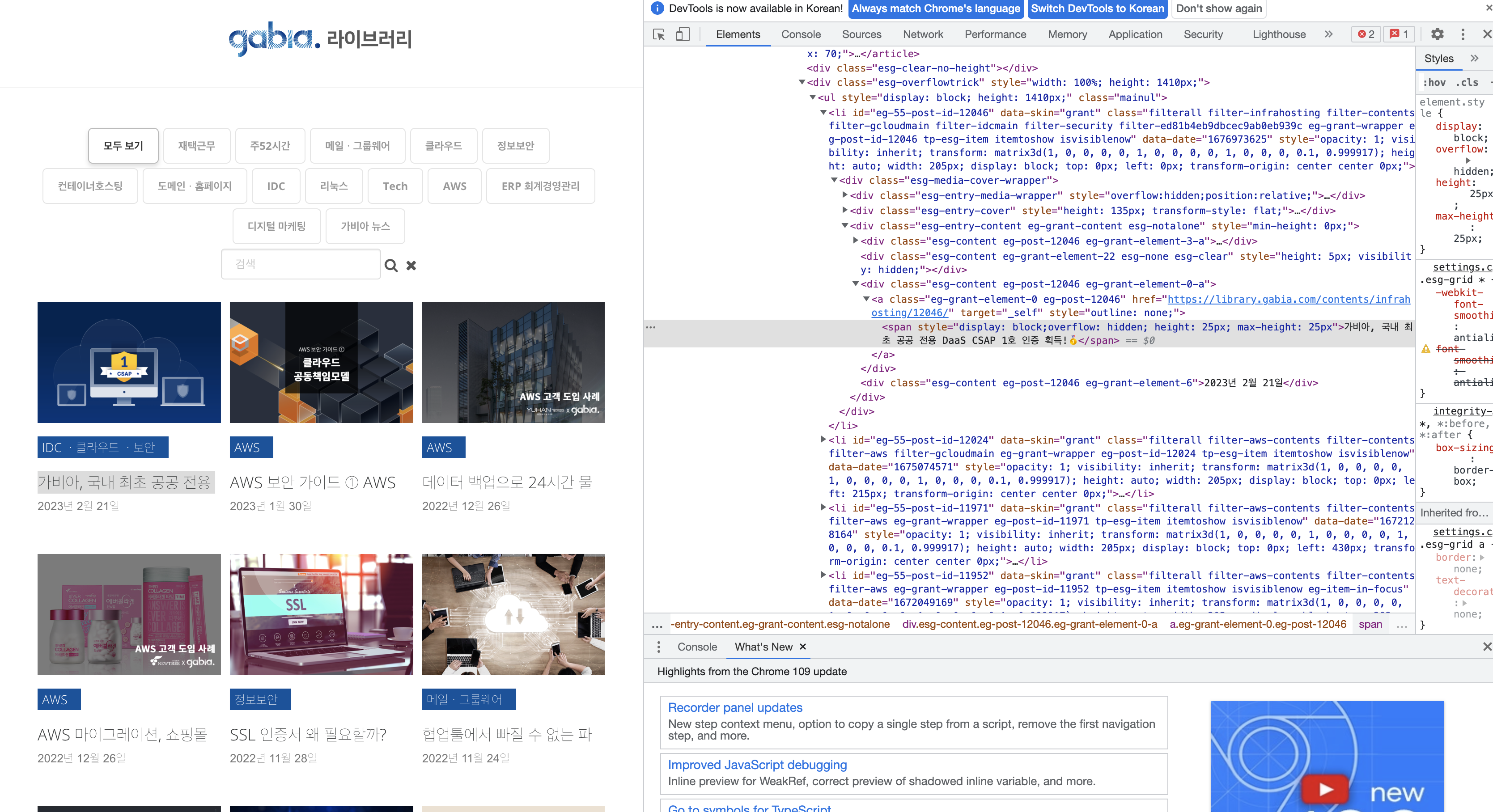 다시 페이지로 돌아가 우클릭 -> 검사로 "클라우드 컴퓨팅의 종류, DaaS란?" 포스터 제목과 "가비아, 국내 최초 공공 전용 DaaS CSAP 1호 인증 획득!" 포스터 제목에 어떤 차이가 있는지 확인한다.