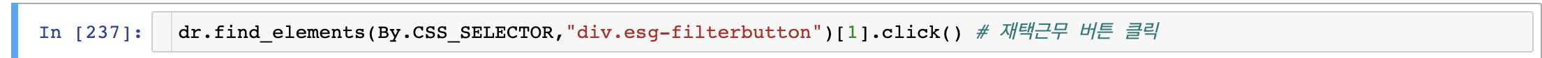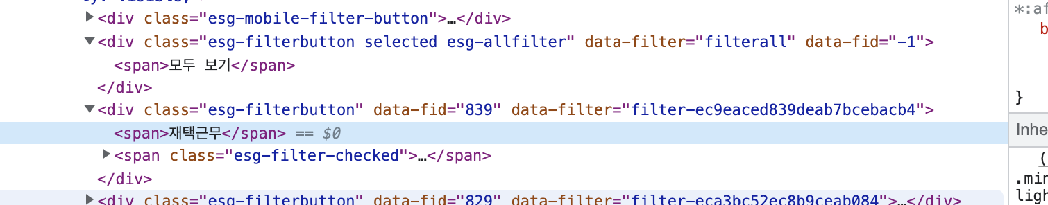 마찬가지로 "재택근무" span tag 바로 위에도 <div class="esg-filterbutton ~~"> 가 보인다.