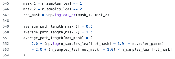 실제 sklearn에 구현된 코드를 보면 n<=1일 때 c=0, n=2 일 때 c=1으로 고정하고, n>=3 부터 c를 계산하여 더해준다.