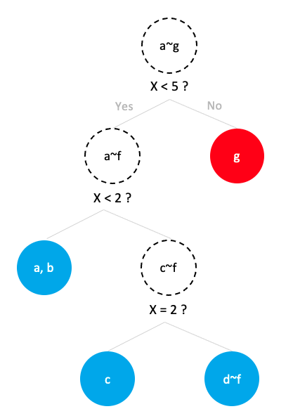 Outlier인 g는 root로 부터 단 한 번의 질문만에 고립되었다. 반면, 다른 데이터들은 두 번, 세 번의 질문이 필요했다.