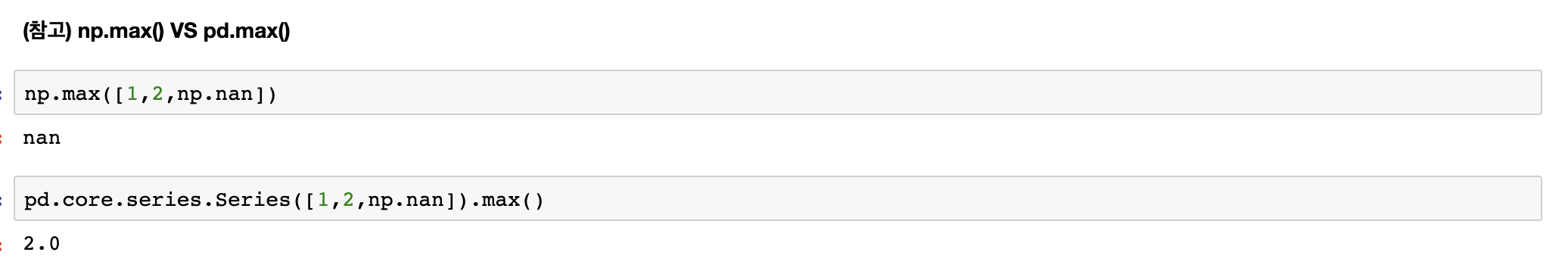 반면, pandas.max() 는 nan이 포함되어 있어도 nan을 제외한 값 중 최대값을 리턴한다.