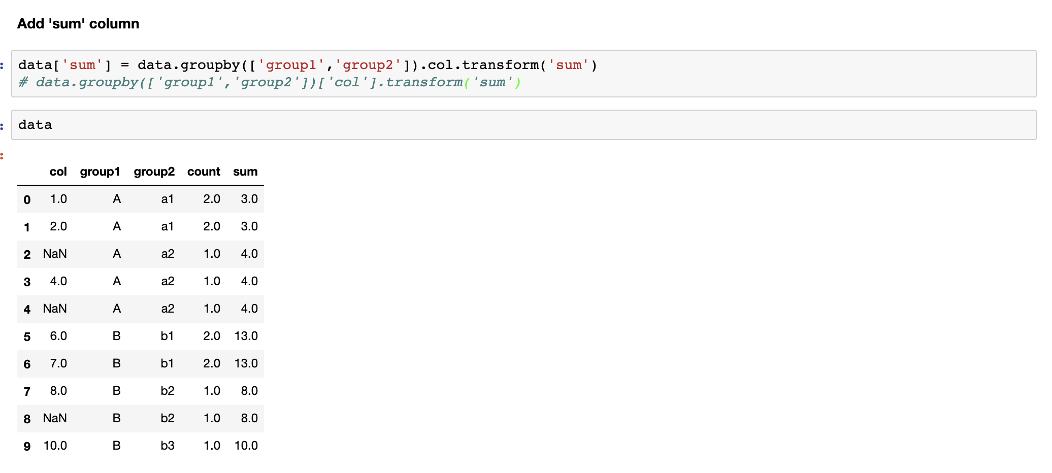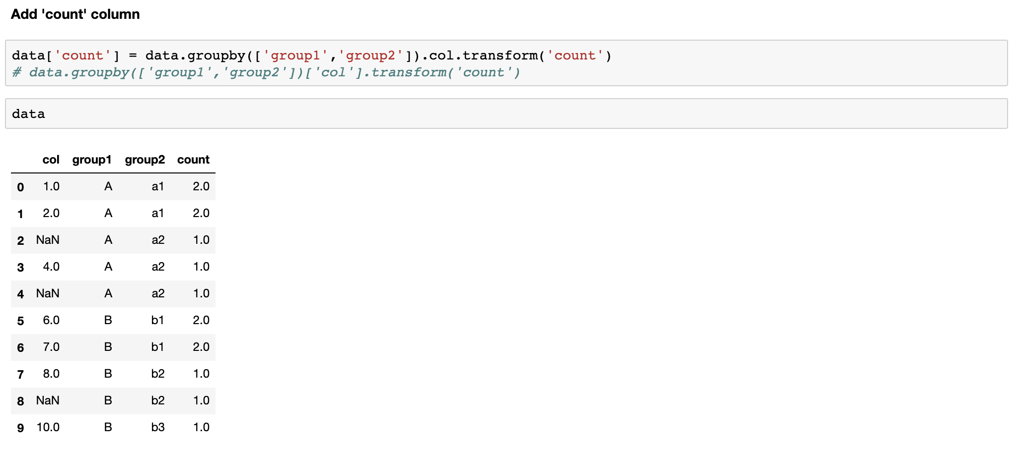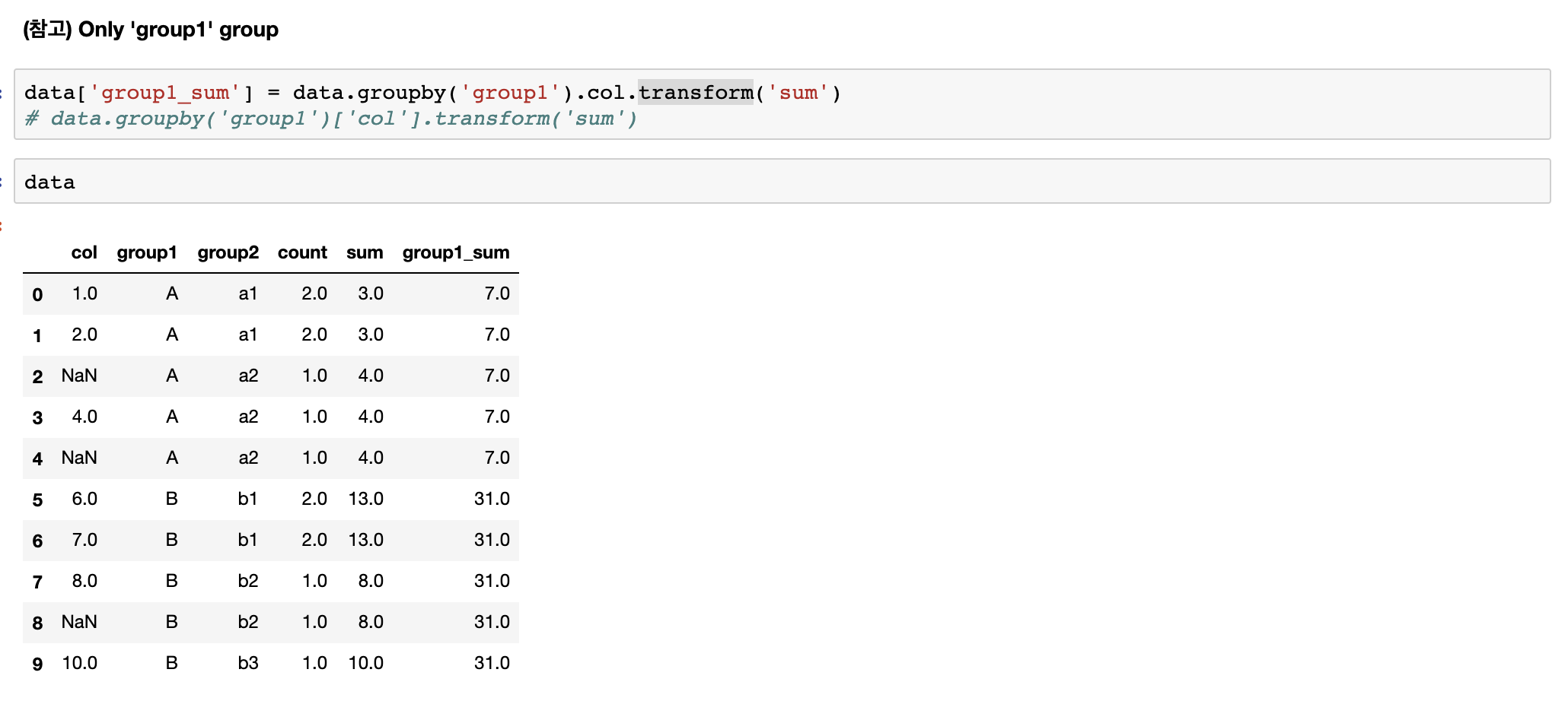 이전 포스팅에서 pandas groupby 에 대해 알아보았다. 이번에는 groupby로 집계한 결과를 각 group 별로 컬럼에 추가하는 방법을 알아보겠다.
