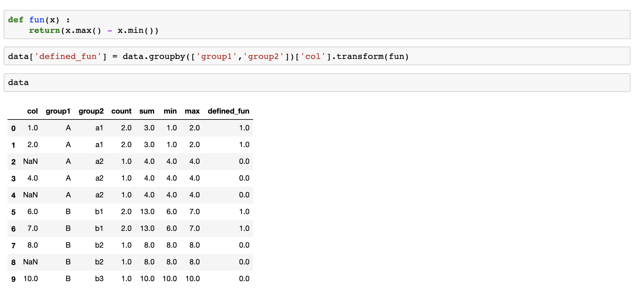위에서 사용자가 정의한 function 부분에 x.max() 가 아니라 max(x) 로 정의했을 때 NaN이 포함된 group 에 대해서는 숫자가 아니라 NaN이 return 되었다.