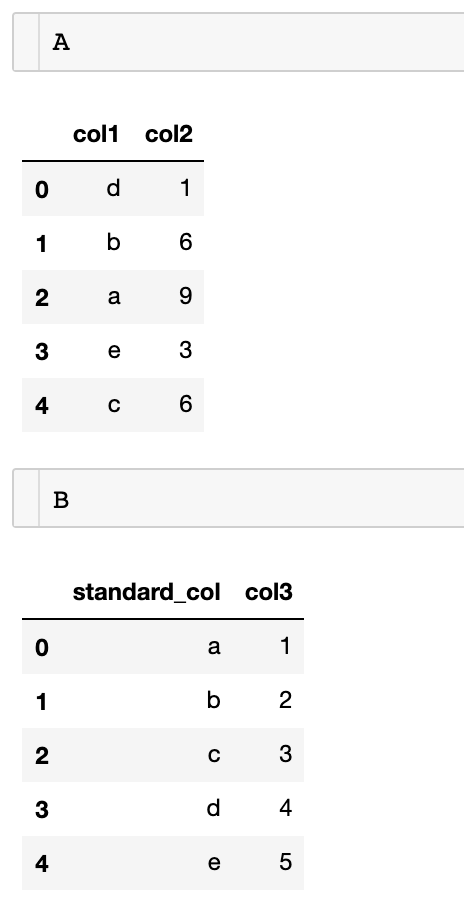 방법은 A 테이블의 index를 'col1' 로 지정해주고, B 테이블에서 'standard_col' 를 기준으로 reindex 해주면 된다.