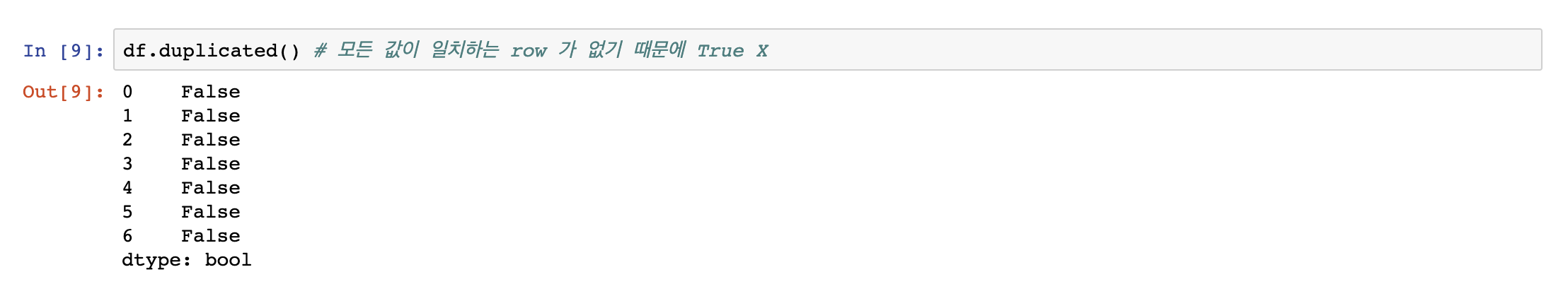 기존처럼 duplicated() 로 확인하면 True 는 없다. 모든 값이 일치하는 row 가 없기 때문이다.
