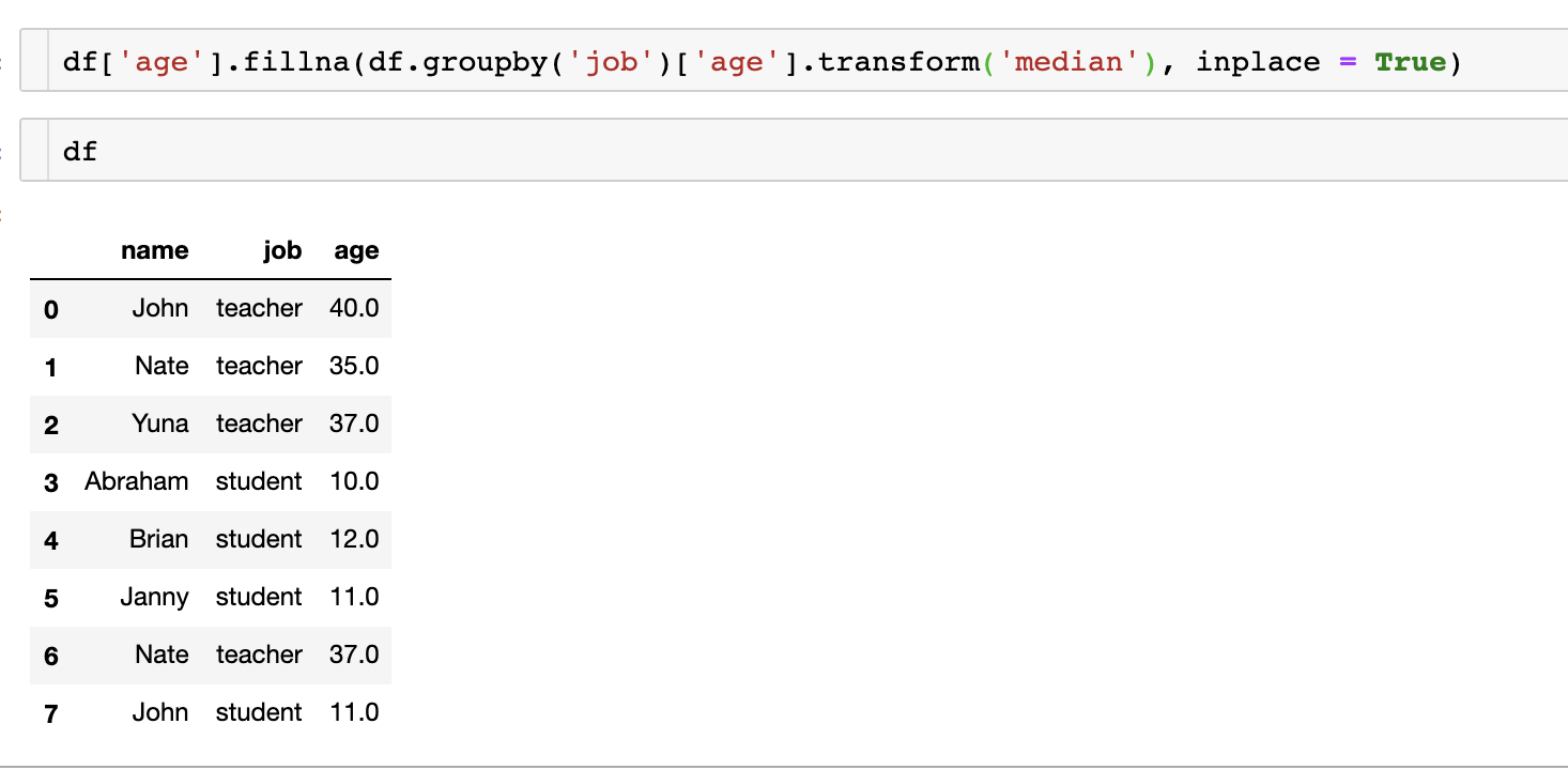 df['age'].fillna(df.groupby('job')['age'].transform('median'), inplace = True)